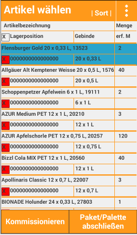 Nachdem der Kommissionier-Auftrag vom MDE übernommen wurde, kann die Erfassung der zu kommissionierenden Artikel beginnen. Anhand verschiedener Sortiermöglichkeiten, wie Lagerpositionen, Artikelbezeichnung usw. werden die Artikel in der App angezeigt.