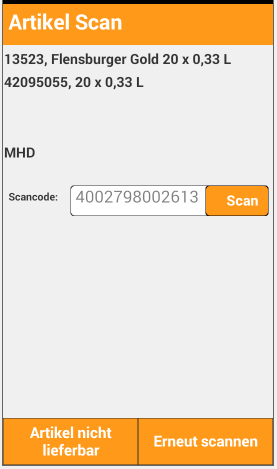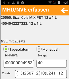 Nach erfolgreicher Bestätigung gelangt man zur Mengenerfassung und dann weiter zur MHD\NVE Erfassung, sofern diese aktiviert wurde.